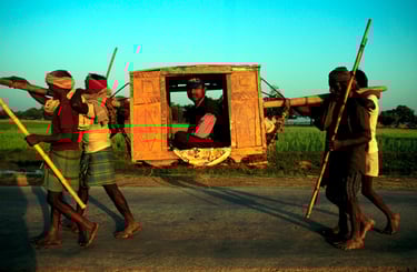 An upper-caste Hindu man is carried to his marriage ceremony in Bihar (India) by lower-caste men on a palanquin, 1995. Copyright: Greg Marinovich (Note: This photograph has been reproduced here with the author's permission only for representation purposes).